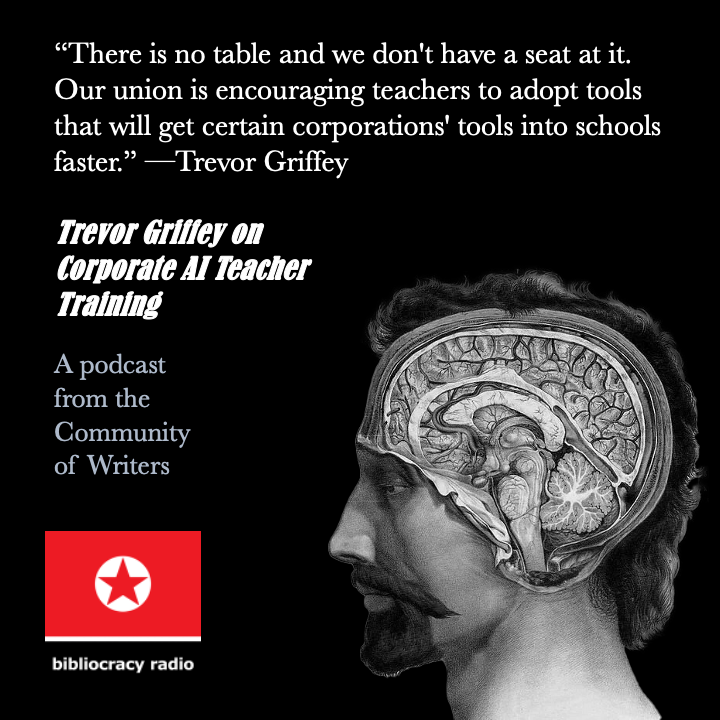 My guest this week is Trevor Griffey. While Bibliocracy Radio is largely devoted to the celebration of book culture and reading, I’ve also frequently and increasingly devoted episodes featuring public policy and political experts, writers, and activists like scholar, teacher, and union advocate Trevor Griffey. How to respond to this news from the New York Times? “The American Federation of Teachers, the second-largest U.S. teachers’ union, said on Tuesday that it would start an A.I. training hub for educators with $23 million in funding from three leading chatbot makers: Microsoft, OpenAI and Anthropic.”