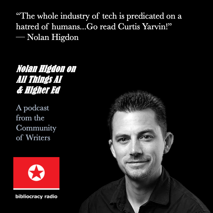 My guest this week is Dr. Nolan Higdon. Today on Bibliocracy Radio I check in again with Nolan Higdon, an activist and scholar on whose perspectives I rely as a result of reading his important work in media literacy and media criticism. Dr. Nolan Higdon is the author of multiple books and articles and academic papers, all with helpfully instructive titles which invite consideration of his analysis of a recent American Association of University Professors (AAUP) report on AI,and his own recent post “AI in Schools: IAAUP report on AI.” We further discuss our own union’s sell-out to Big Tech and the impacts economic, social, and pedagogical of the further corporatization of higher education. Read his Truth Dig article Randi Weingarten’s AI Betrayal. And see his Substack: https://nolanhigdon.substack.com/